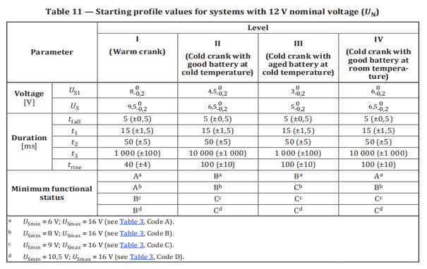 在分別在表3或表4中所示的電源電壓范圍內(nèi)進(jìn)行測試時,在主動運行模式下,需要在ISO 16750-1中定義的功能狀態(tài)A。此范圍外功能狀態(tài)至少應(yīng)達(dá)到D級,必要時可要求達(dá)到更嚴(yán)酷的C級。