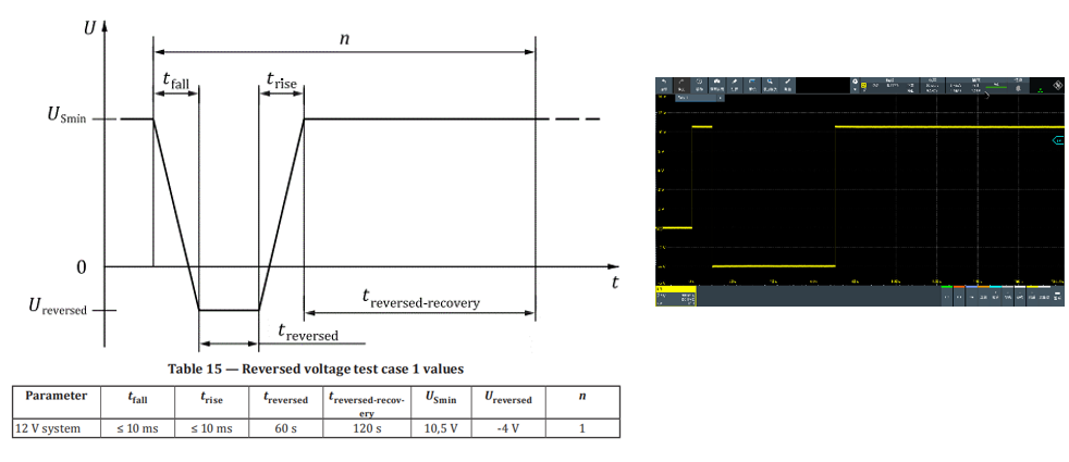 24V系統(tǒng)反向電壓為-28V,從0V通過tfall ≤10ms下降至-28V,保持60s后通過trise ≤1000ms從-28V上升至0V,保持120s。