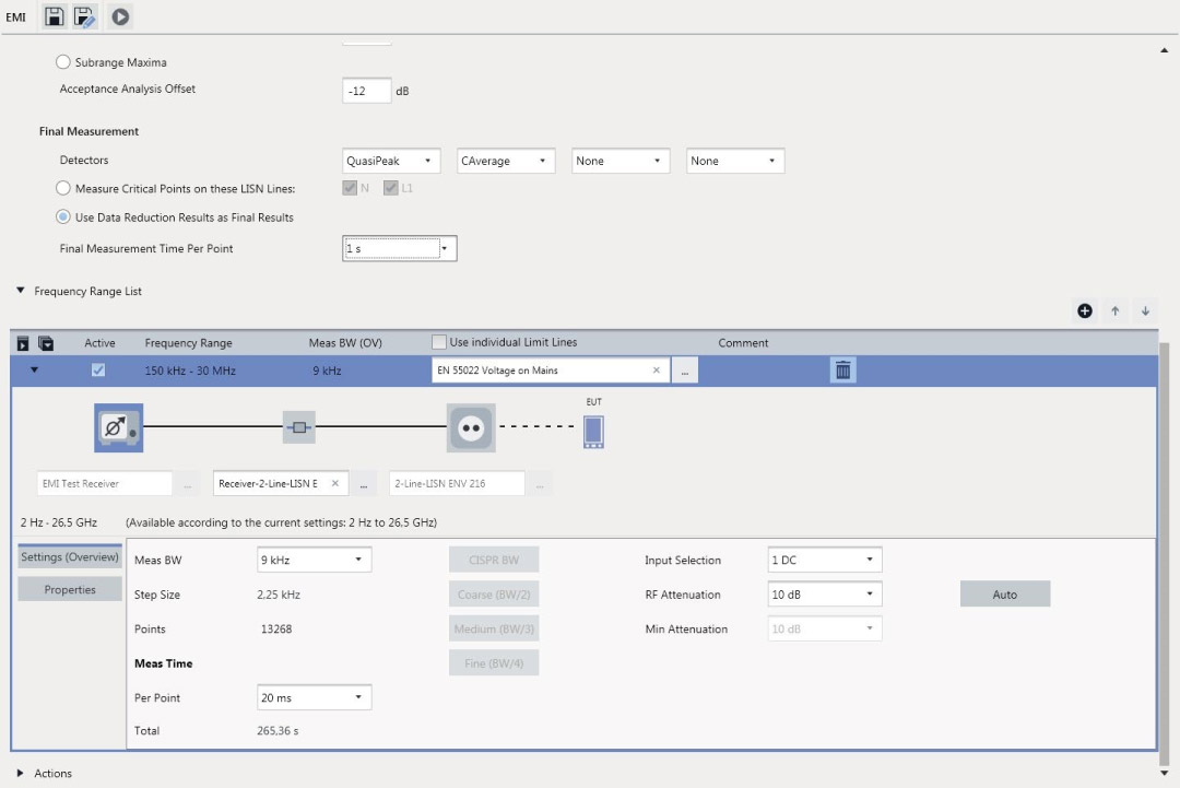 圖 2:電壓發(fā)射測(cè)量的配置。測(cè)量設(shè)置、頻率范圍、限值和附件整齊地組合在一起。