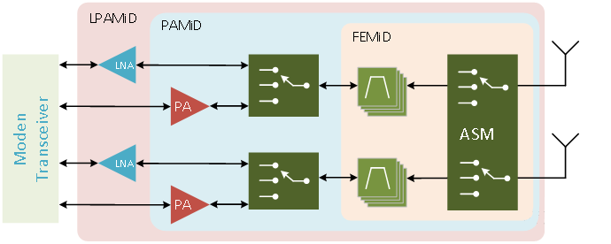 迅速增加的頻段和射頻器件數(shù)量為智能手機(jī)帶來了挑戰(zhàn),除了復(fù)雜度的提升以外,對(duì)射頻器件占用空間的逐步壓縮和載波聚合的應(yīng)用,使得傳統(tǒng)的分離式射頻器件越來越難以滿足新的需求,射頻器件模組化已成行業(yè)發(fā)展趨勢。依據(jù)不同需求,射頻前端模組的構(gòu)成也有所差別,下圖為幾種典型的原理框圖。其中開關(guān)的控制接口是標(biāo)準(zhǔn)化的MIPI 接口。