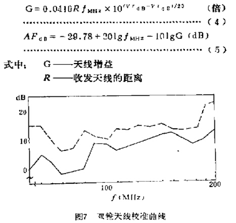 圖7說明,測試天線架高2m,距離1m。在開闊場地測量時,天線周圍3m距離范圍之內(nèi)無障礙物,在屏蔽到內(nèi)測量時,天線置于屏蔽室的幾何中心利用(4)(5)兩式即可給出天線校準系數(shù)的頻響關(guān)系曲線。圖7給出了雙錐天線在開闊場與屏蔽室內(nèi)的校準曲線。從上圖中我們發(fā)現(xiàn),在30~200MHz范圍內(nèi),雙錐天線在開闊場與屏蔽室內(nèi)的校準曲線具有大致相同的趨勢。由于屏蔽室內(nèi)存在反射現(xiàn)象,因而天線系數(shù)明顯高于自由空間開闊場的校準系數(shù)。