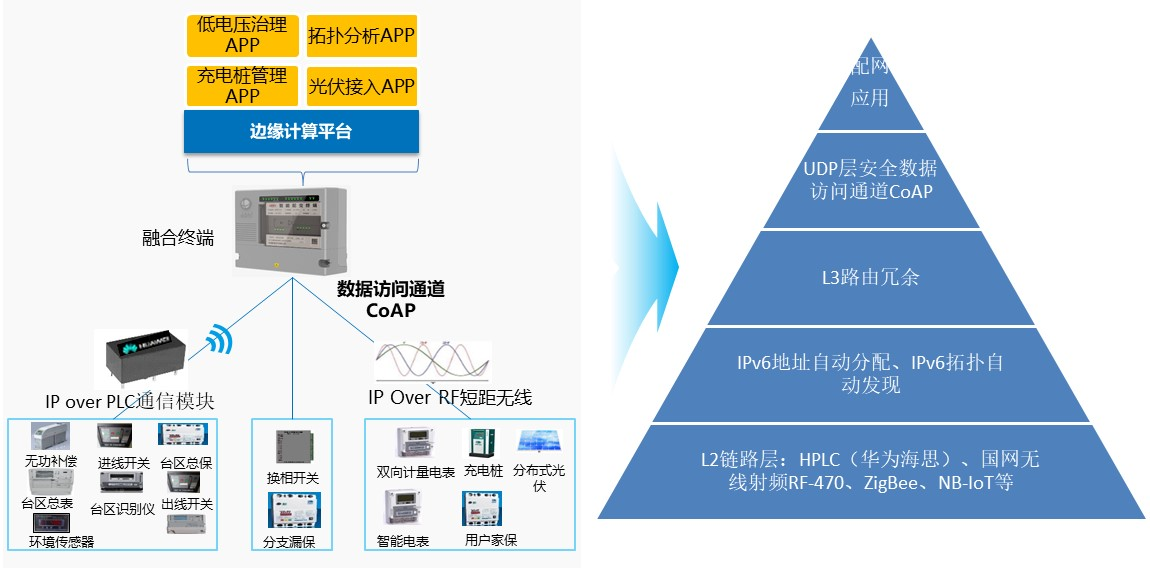在物聯(lián)網(wǎng)的L3層引入IPv6協(xié)議棧,將能夠充分滿足電力配用電物聯(lián)網(wǎng)對云-端、以及云-邊-端等多種通信模式的需求。電科院和華為通過采用基于IPv6的短距物聯(lián)通信技術,制定出臺區(qū)營配智能終端的企業(yè)標準,該標準對配用電臺區(qū)智能終端的遠距離及本地短距離通信接口進行了規(guī)范,從而推動了傳統(tǒng)電網(wǎng)邊緣設備向智能化和IPv6數(shù)據(jù)化的趨勢發(fā)展,并解決了電網(wǎng)最后一公里的數(shù)據(jù)采集問題。