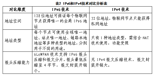 利用6LoWPAN報文壓縮技術,IPv6能夠在L2層HPLC和微功率無線網(wǎng)絡上順利運行。這使得支持IPv6技術不會產(chǎn)生明顯的開銷,使IPv6在低速網(wǎng)絡上的應用成為可能。與IPv4相比,IPv6具有更大的優(yōu)勢,特別適用于物聯(lián)網(wǎng)中大量異構終端的接入場景。IPv6和IPv4的技術對比如下表所示。