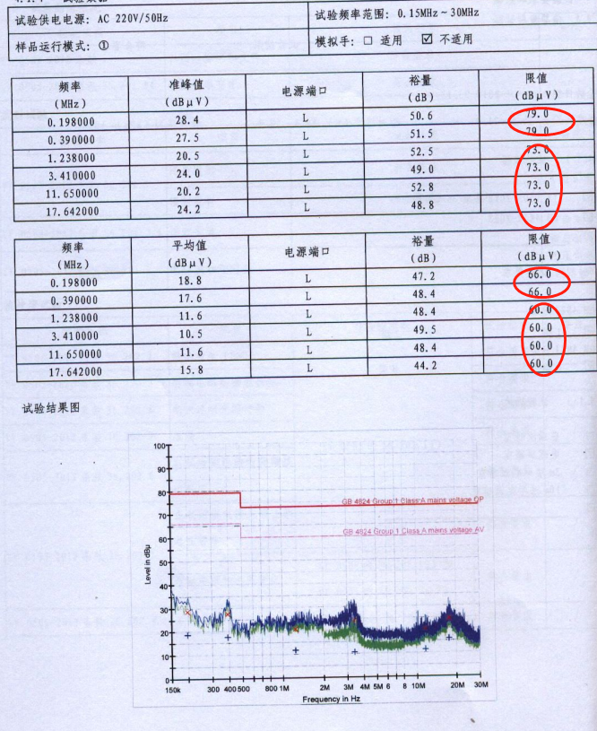 只進(jìn)行了電源端口測(cè)試:由上圖及測(cè)試表格可知電源端口L&N在不同頻率段的測(cè)量值都在相應(yīng)的限值范圍內(nèi),故該產(chǎn)品傳導(dǎo)發(fā)射測(cè)試合格。