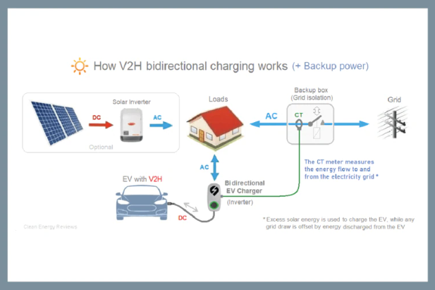 圖2:使用V2H系統(tǒng)為家庭供電時(shí)直流雙向充電器的基本能量流動(dòng)圖,以及用于測(cè)量電網(wǎng)能量流動(dòng)的CT電表(圖片來(lái)源:Clean Energy Reviews)。