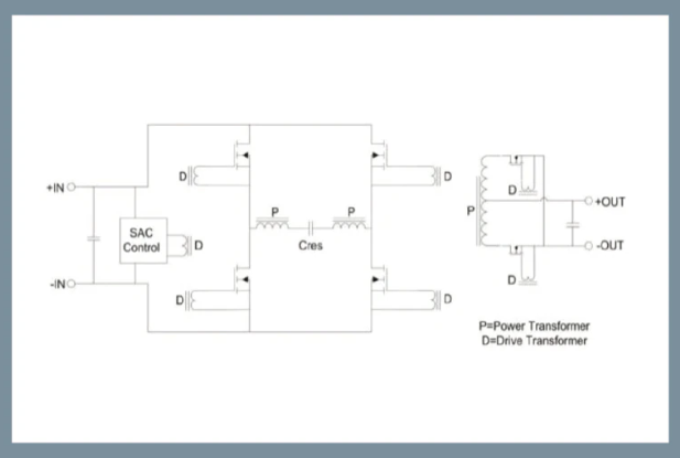 一側(cè)有一個(gè)開(kāi)關(guān)橋(switching bridge),通常會(huì)被視為一個(gè)斬波DC母線的直流輸入,而另一側(cè)的布局基本相同,可以被稱為同步整流器。只要這兩條路徑與中心“儲(chǔ)能器”的諧振波形同步切換,整個(gè)器件就是對(duì)稱的,作用就像DC變壓器。
