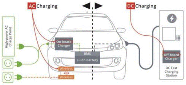 圖2顯?出交流充電和直流充電之間的差異,對(duì)于交流充電(圖2左側(cè)),將OBC插?標(biāo)準(zhǔn)交流插座,OBC將交流電轉(zhuǎn)換為適當(dāng)?shù)闹绷麟姙殡姵爻潆?。?duì)于直流充電(圖2右側(cè)),充電樁直接給電池充電。