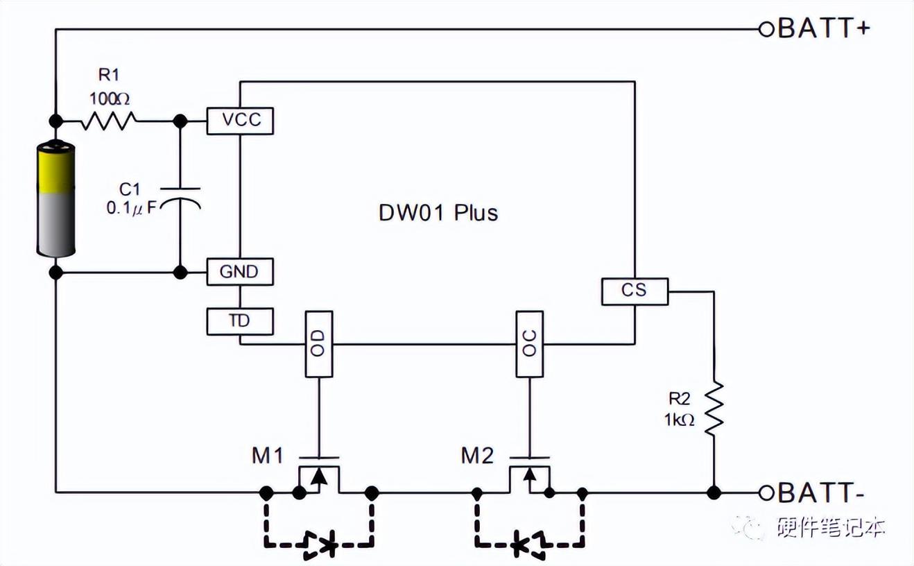 在DW01芯片與8205 MOS管應(yīng)用電路圖中,BATT+屬于鋰電池放電的正極,BATT-屬于鋰電池放電的負(fù)極。