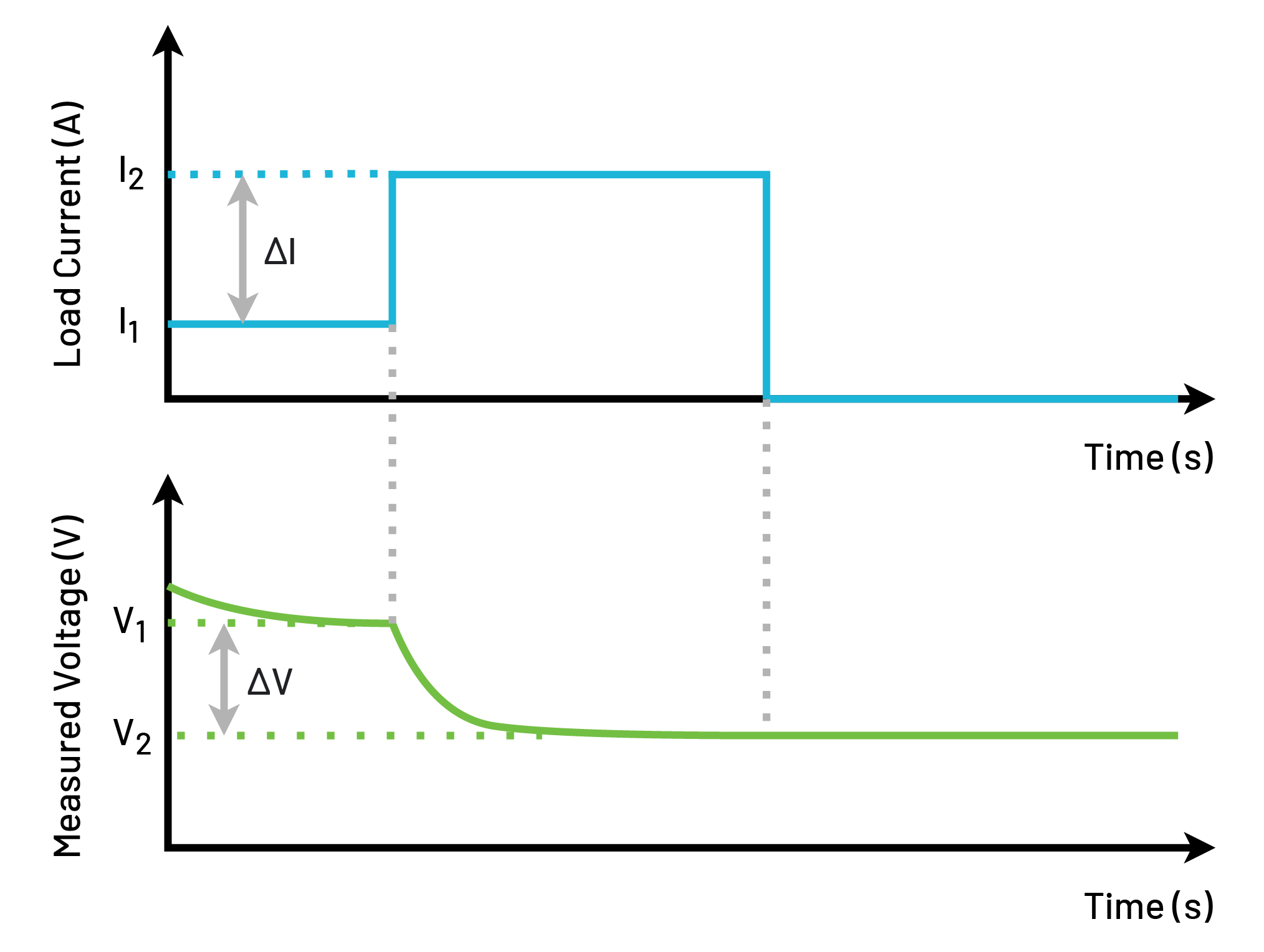 在一定的時間內(nèi)對電池施加直流電流。測量電池電壓的變化以計算電阻。圖 3中的圖表對此進行了演示。